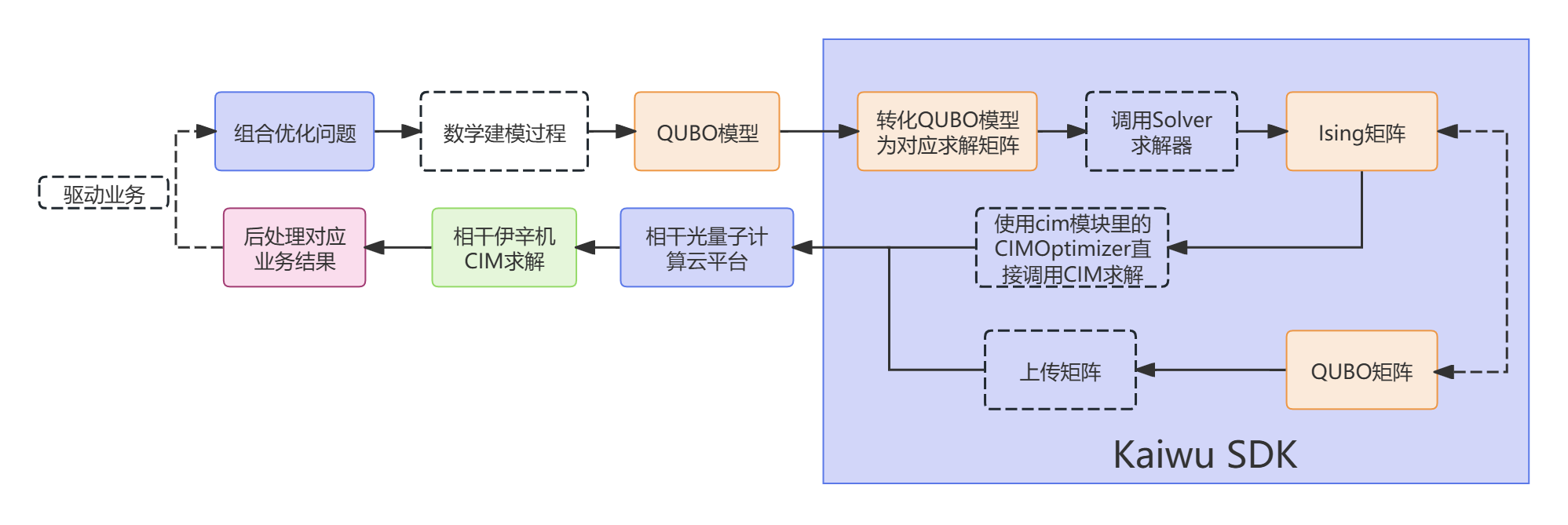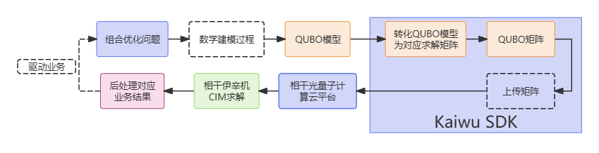 流程:安装调用Kaiwu SDK → QUBO Model → QUBO矩阵 → 云平台 → CIM求解