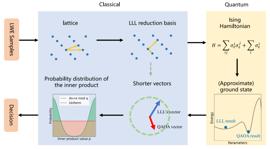 将 LWE 问题“转化”成为“找最短路径”问题(SVP),再将转化出的 SVP 问题“编码”成量子计算机能理解的能量模型(伊辛模型)。接下来,利用 NISQ 设备擅长的量子优化算法(如 QAOA),在经典计算机的配合下,寻找能量模型(伊辛模型)的最低点,从而揭示出 LWE 问题的秘密。
