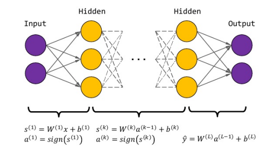 在本文中QNN的网络建构选择了具有等宽隐藏层的全连接网络,采用符号函数(sign)作为激活函数。