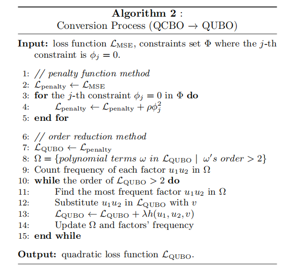 利用Rosenberg降阶法,不断通过一阶因子替代,最终实现降阶,得到二次损失函数,成功将训练QCBO问题转化为QUBO问题。