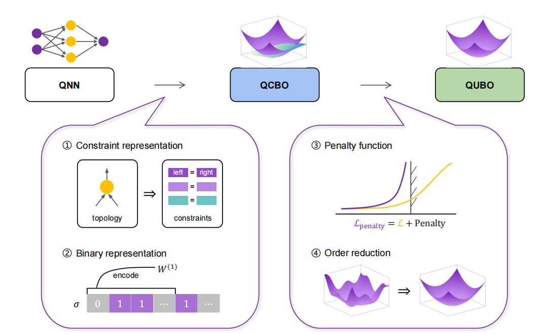 为解决上述问题,本文提出了将量化神经网络(QNN)通过将复杂的网络函数关系转化为等式约束,将网络参数量化为离散值,转化为带有约束的二元优化问题(QCBO),再通过惩罚函数和Rosenberg降阶法,转化为二元无约束优化问题(QUBO),使其能在Ising机上求解。