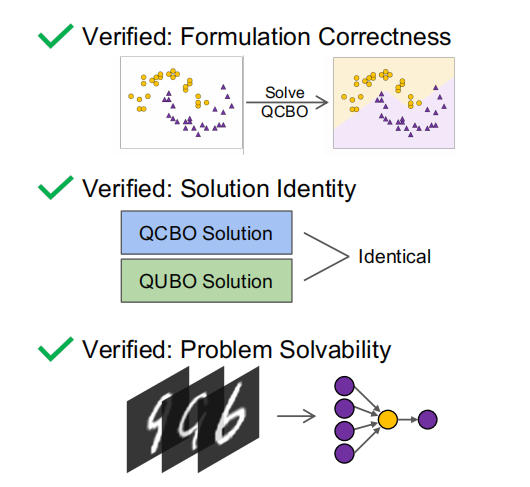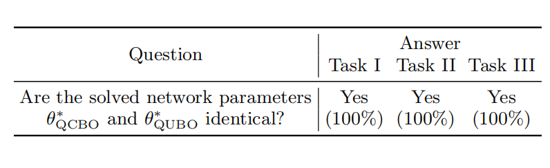 对比前后实验的二进制变量的数量、模型的求解结果、损失和准度等,证实了QCBO转化为QUBO后并不改变解。