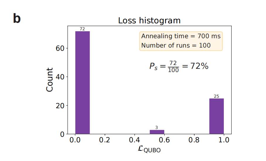 我们在Fixstars Amplify AE (GPU模型的Ising机)上进行实验,设置退火时间为700ms,输出损失直方图如下: