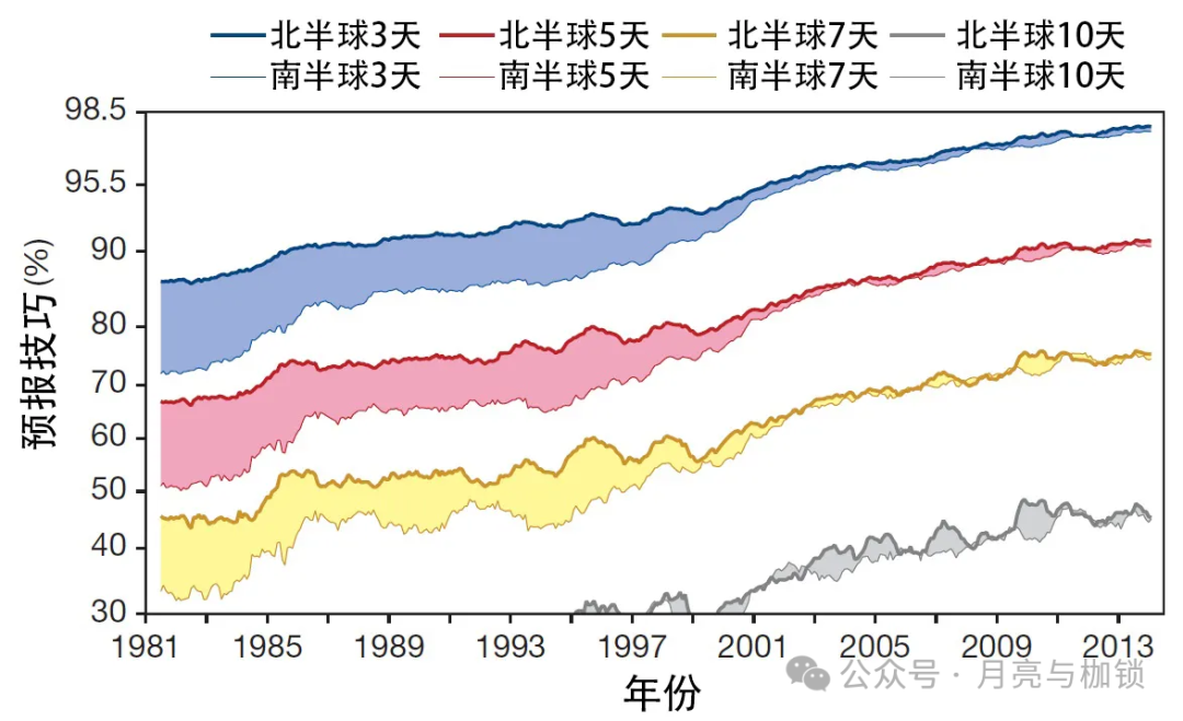 图2 以热带以外的北半球和南半球计算的三天、五天、七天和十天的预报技巧。预报技巧是在500百帕高度层上的预报和用于验证的分析场各自对气候平均高度的异常之间的相关性。超过60%的数值表示可用的预报,超过80%的数值表示准确度很高。1999年之后北半球和南半球曲线的收敛是由于使用变分方法处理卫星资料带来的突破。