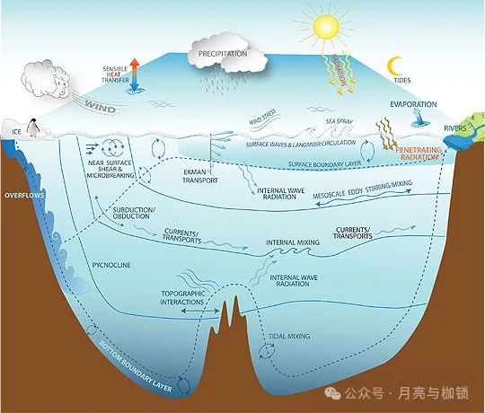 图3 海洋中的小尺度混合过程示意图 (引自:http://www.gfdl.noaa.gov/ocean-mixing) 此外,数据同化还能通过分析和吸收特定变量(如海洋温度)的观测数据,提升数值模型的整体模拟能力。这使得即便在没有观测数据支持的网格点上,也能获得高质量的状态估计,这一过程被称为数据同化再分析。当前,许多再分析产品作为观测数据的替代品已广泛应用,如美国国家环境预报中心的再分析数据集(NCEP Reanalysis Dataset)和美国国家环境信息中心的海洋再分析产品(GODAS)等。
