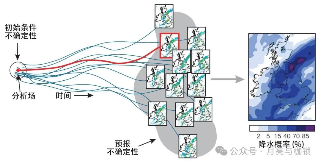 图4 用于估计英国降水概率的36小时集合预报示意图。单一预报(中间红框)通过将模式从初始大气状态分析场(左侧)向前进行时间积分获得。在已知的分析误差内的对分析场的小扰动能够提供一组预报解的集合,这一集合对预报的不确定性加以代表(中间的多个框)。将这些预报解以一些空间相邻采样方法相结合便可提供平滑的降水概率估计(右侧)。图片来自K. Mylne(英国气象办公室)。