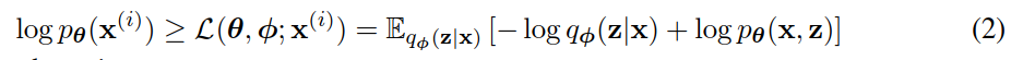 边际似然(marginal likelihood)由单个数据点的边际似然之和组成 𝑙𝑜𝑔𝑝𝜃(𝑥(1),𝑥(𝑁))=∑𝑖=1𝑁𝑙𝑜𝑔𝑝𝜃(𝑥(𝑖)) ​ ,可以分别改写为: