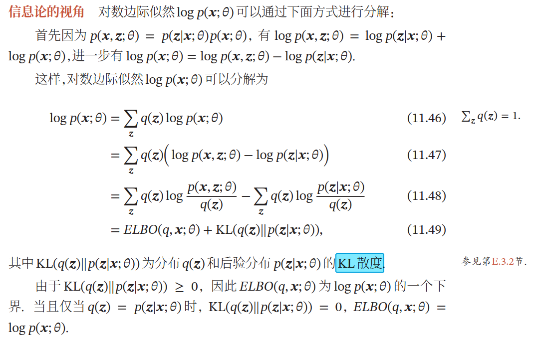 第一个最大化交叉熵(maximising cross entropy,RHS)项是近似与真实后验的KL散度。由于这个KL散度是非负的,第二个RHS项 𝐿(𝜃;𝜙;𝑥(𝑖)) ​ 称为数据点的边际似然的(变分)下界,可以写成: