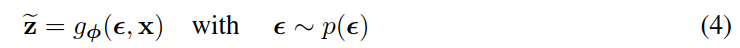 在2.4节(即本文中的2.3.4节重参数化技巧)中概述的某些温和条件下,对于选择的近似后验 𝑞𝜙(𝑧|𝑥) ​ ,我们可以使用(辅助)噪声变量的可微变换 𝑔𝜙(𝜖,𝑋) ​ 来重参数化随机变量 𝑧~∼𝑞𝜙(𝑧|𝑥) ​ :