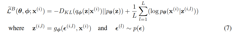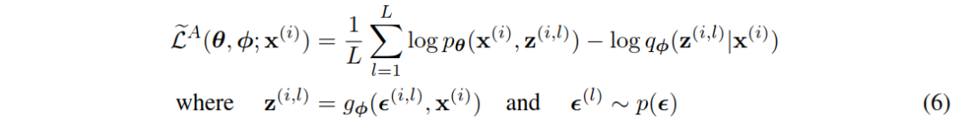 我们将这种技术应用于变分下界(variational lower bound, eq.(2)),得到我们的通用随机梯度变分贝叶斯(Stochastic Gradient Variational Bayes, SGVB)估计器 𝐿~𝐴(𝜃,𝜙;𝑥(𝑖))∼𝐿(𝜃,𝜙;𝑥(𝑖)) ​ :