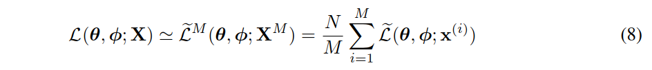 给定来自具有 𝑁 ​ 个数据点的数据集的多个数据点,我们可以基于minibatch构造完整数据集的边际似然下界(marginal likelihood lower bound)的估计量: