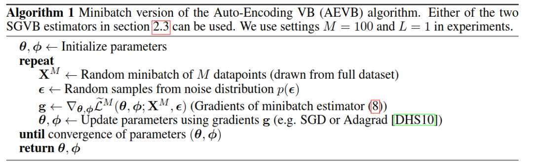 其中minibatch 𝑋𝑀={𝑥(𝑖)}𝑖=1𝑀 ​ 是从具有 𝑁 ​ 个数据点的完整数据集 𝑋 ​ 中随机抽取的 𝑀 ​ 个数据点的样本。在我们的实验中,我们发现只要小批量大小 𝑀 ​ 足够大(例如 𝑀=100 ​ ),每个数据点的样本数量 𝐿 ​ 可以设置为1。得到的梯度 ∇𝜃,𝜙𝐿~(𝜃;𝑋𝑀) ​ ,可以与SGD或Adagrad等随机优化方法结合使用[DHS10]。计算随机梯度的基本方法见算法1。