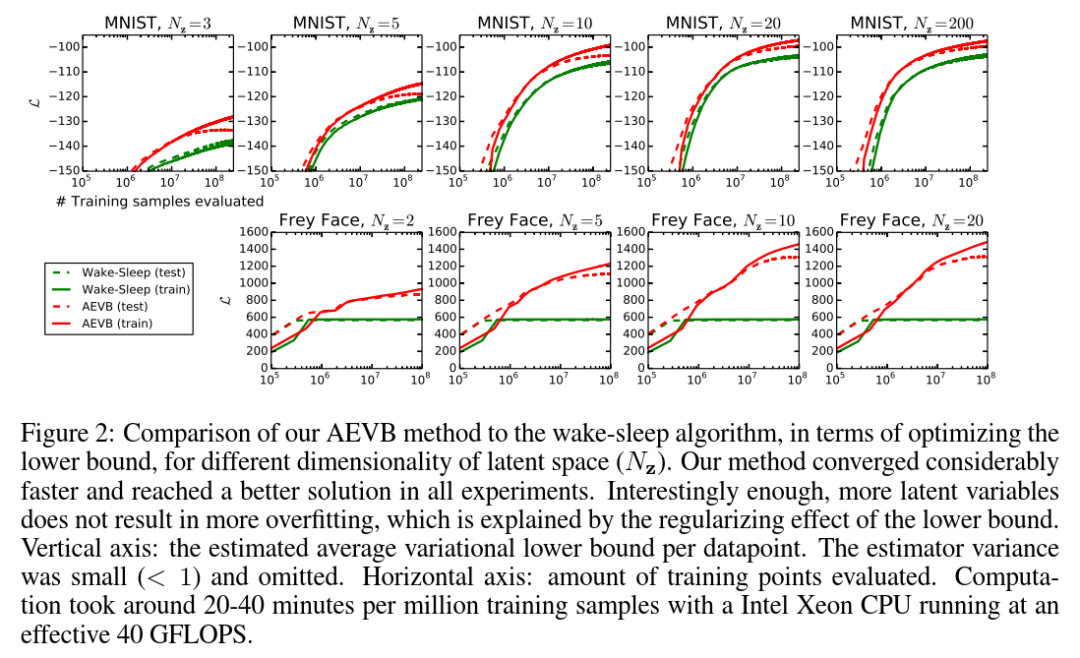 我们训练了生成模型(解码器)和相应的编码器(又名识别模型),在MNIST的情况下有500个隐藏单元,在Frey Face数据集的情况下有200个隐藏单元(为了防止过拟合,因为它是一个相当小的数据集)。隐藏单元数的选择是基于先前的自编码器文献,不同算法的相对性能对这些选择不太敏感。图2显示了比较下界时的结果。有趣的是,多余的潜在变量不会导致过拟合,这可以用变分界的正则化性质来解释。