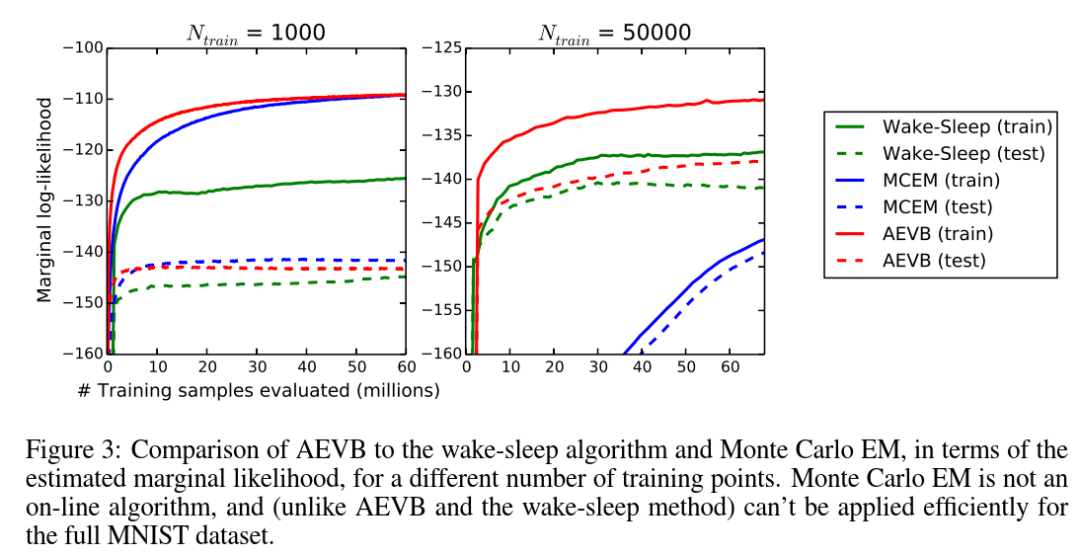 对于非常低维的潜在空间,可以使用马尔可夫链蒙特卡罗方法(MCMC)估计器估计学习生成模型的边际似然。关于边际似然估计的更多信息可在附录中找到。对于编码器和解码器,我们再次使用神经网络,这一次有100个隐藏单元和3个潜在变量;对于高维潜在空间,估计变得不可靠。同样,我们使用了MNIST数据集。采用混合蒙特卡罗(Hybrid Monte Carlo, HMC)[DKPR87]采样器将自编码变分贝叶斯(AEVB)和Wake - Sleep方法与蒙特卡罗最大似然估计(Monte Carlo Expectation Maximization, MCEM)进行比较;详情见附录。我们比较了三种算法的收敛速度,小和大的训练集大小。结果如图3所示。