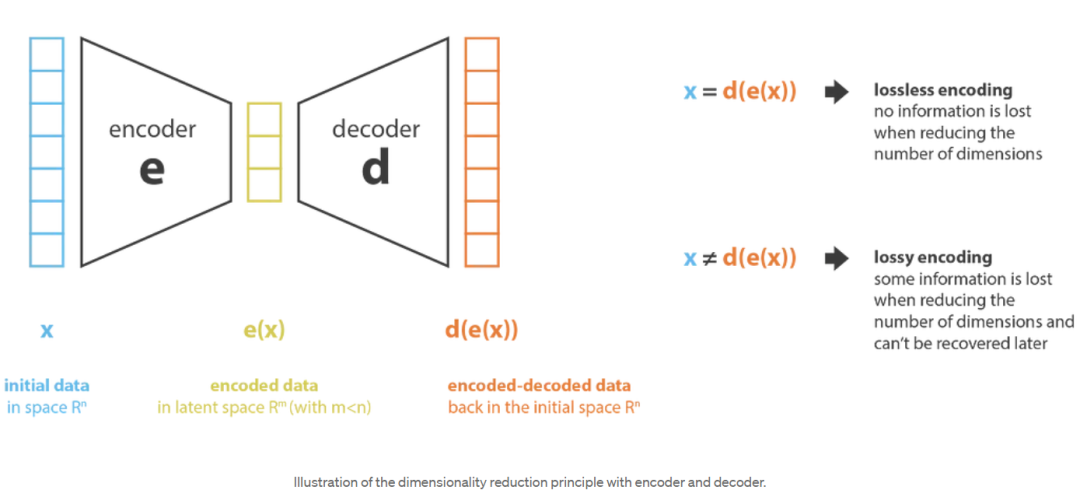 首先,我们将编码器(encoder)称为从“旧特征”表示(通过选择或提取)产生“新特征”表示的过程,而将解码器(decoder)称为相反的过程。降维可以解释为数据压缩,其中编码器压缩数据(从初始空间压缩到编码空间,也称为潜在空间latent space),而解码器解压它们。当然,根据初始数据分布、潜在空间维度和编码器定义的不同,这种压缩可能是有损的,这意味着在编码过程中丢失了一部分信息,在解码时无法恢复。