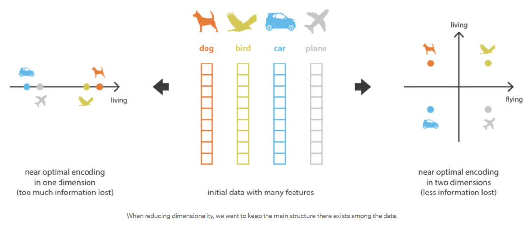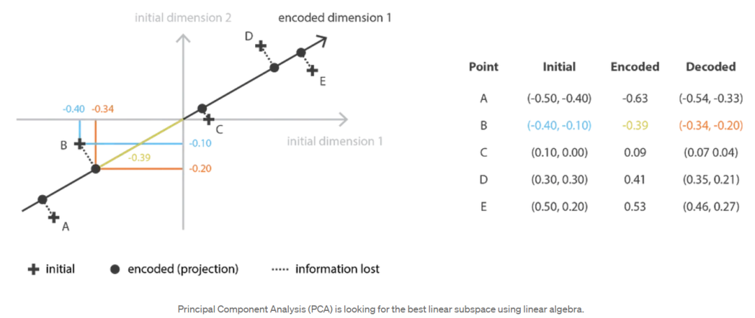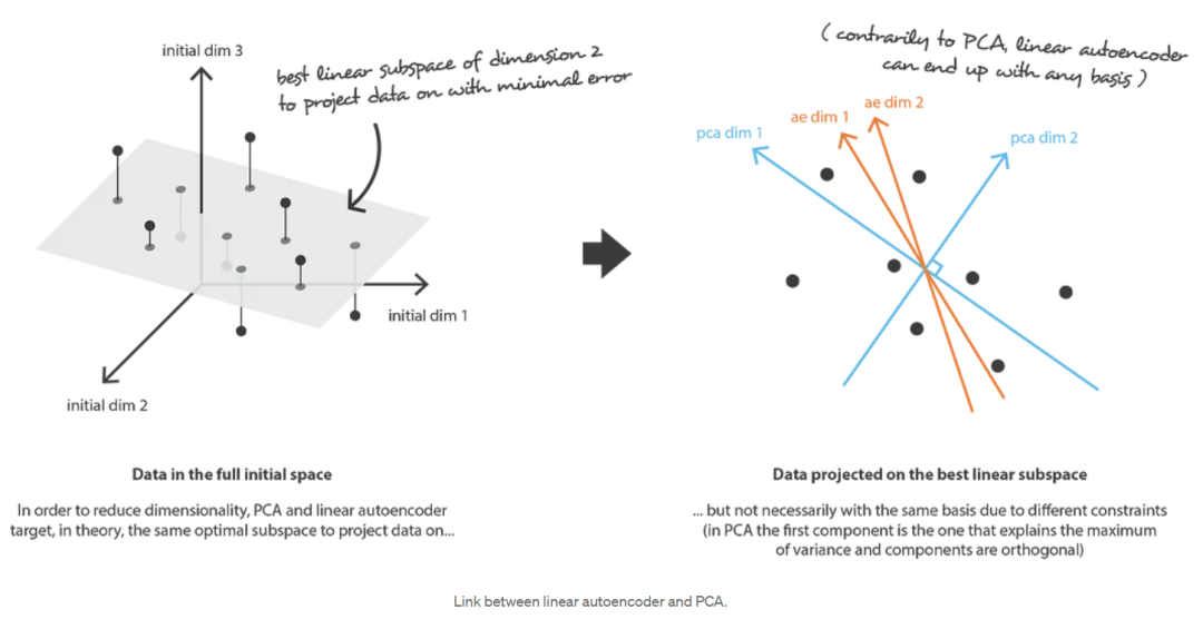 当谈到降维时,首先想到的方法之一是主成分分析(Principal components analysis, PCA)。为了展示它是如何符合我们刚刚描述的框架,并与自动编码器建立链接,让我们对主成分分析(PCA)的工作原理进行一个非常高的概述,把大多数细节放在一边(注意,我们计划写一篇关于这个主题的完整文章)。