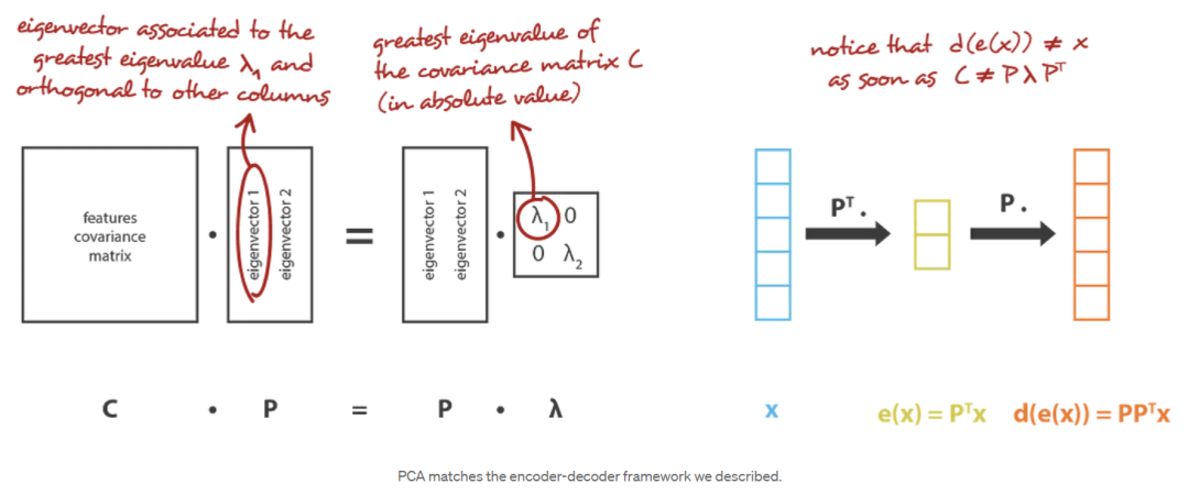 在我们的全局框架中,我们正在寻找行正交(特征无关)的( n_e ×n_d )矩阵(线性变换)的( E )族中的编码器,以及( n_d ×n_e )矩阵的( D )族中的相关解码器。可以证明,协方差特征矩阵的( ne )个最大特征值(范数)对应的酉特征向量是正交的(或可以选择正交的),并定义了( ne )维的最佳子空间,以最小的近似误差投影数据。因此,可以选择这些( ne )特征向量作为我们的新特征,因此,降维问题可以表示为特征值/特征向量问题。此外,还可以证明,在这种情况下,解码器矩阵是编码器矩阵的转置。