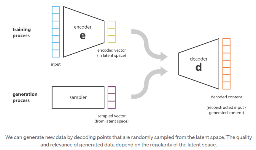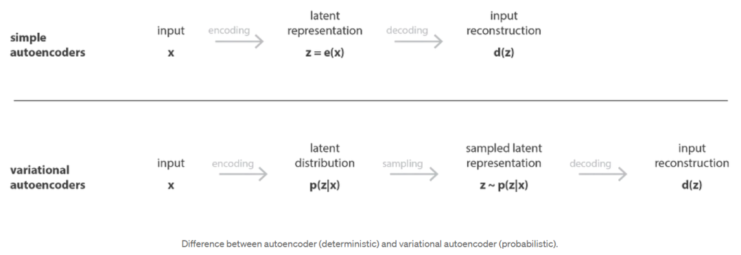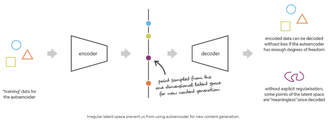 · 由于过拟合,自编码器的潜在空间可能是非常不规则的(潜在空间中接近的点可能会给出非常不同的解码数据,潜在空间中的某些点一旦解码后可能会给出无意义的内容……),因此,我们无法真正定义一个生成过程,即简单地从潜在空间中采样一个点,并使其通过解码器获得新数据。