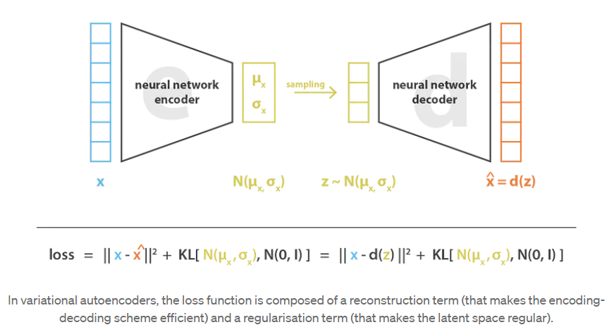 因此,训练变分自编码器(VAE)时最小化的损失函数由一个“重建项”(在最后一层)和一个“正则化项”(在潜在层)组成,它倾向于使编码-解码方案尽可能高效,它倾向于通过使编码器返回的分布接近标准正态分布来正则化潜在空间的组织。该正则化项表示为返回分布与标准高斯分布之间的Kulback-Leibler散度,并将在下一节中进一步证明。我们可以注意到,两个高斯分布之间的Kullback-Leibler散度有一个封闭的形式,可以直接用两个分布的均值和协方差矩阵表示。