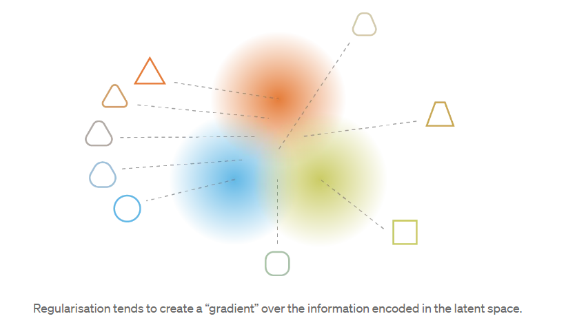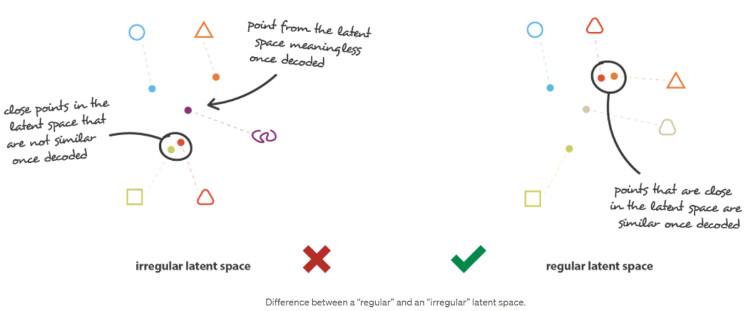 为了使生成过程成为可能,从潜在空间中期望的规律性可以通过两个主要属性来表达:连续性(continuity, 潜在空间中的两个接近的点在解码后不应该给出两个完全不同的内容)和完备性(completeness, 对于选定的分布,从潜在空间中采样的点在解码后应该给出“有意义的”内容)。