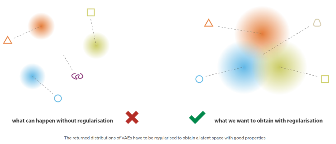 变分自编码器(VAE)s将输入编码为分布而不是简单的点,这一事实不足以确保连续性和完整性。如果没有定义良好的正则化项,模型可以学习,为了最小化其重建误差,“忽略”返回分布的事实,并且表现得几乎像经典的自编码器(导致过拟合)。为此,编码器可以返回具有微小方差的分布(这往往是准时分布),也可以返回具有非常不同的方法的分布(这将在潜在空间中彼此相距很远)。在这两种情况下,都错误地使用了分布(取消了预期的好处),并且不满足连续性和/或完整性。 因此,为了避免这些影响,我们必须对协方差矩阵和编码器返回的分布的均值进行正则化。在实践中,这种正则化是通过强制分布接近标准正态分布(集中和减少)来完成的。这样,我们要求协方差矩阵接近单位矩阵(identity),防止出现点状分布,均值接近0,防止编码分布彼此相距太远。