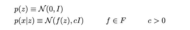 现在我们假设p(z)是一个标准高斯分布,p(x|z)是一个高斯分布,它的均值由变量z的确定性函数定义,它的协方差矩阵的形式是一个正常数c乘以单位矩阵I。假设函数f属于一个函数族F,这个函数族暂时不确定,以后会选择它。因此,我们有