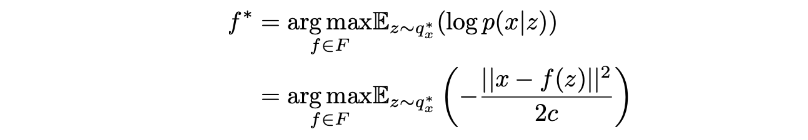 因此,让我们考虑一下,正如我们之前讨论的那样,我们可以得到中的任何函数F中的任何函数f每个函数定义一个不同的概率解码器p(x|z)的后验概率p(z|x)的最佳近似值,记为qx∗(z)。尽管它的概率性质,我们正在寻找一个尽可能高效的编码解码方案,然后,我们想要选择函数f,当z从qx∗(z)中采样时,它使给定z的x,当我们从分布qx∗(z)中采样z,然后从分布p(x|z)中采样时,我们想要最大化x^=x的概率。因此,我们正在寻找最优的f∗,使得