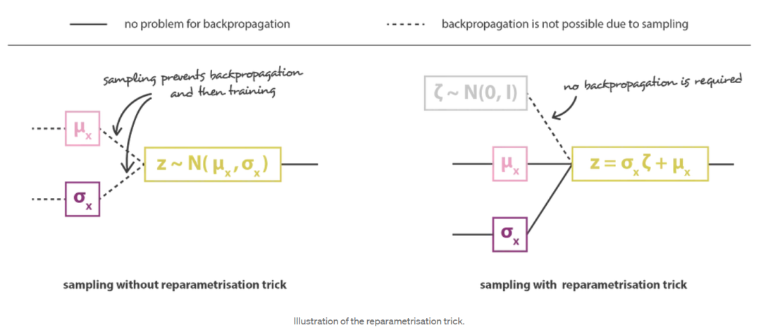 然后通过连接编码器和解码器部分获得总体架构。然而,我们仍然需要非常小心我们在训练期间从编码器返回的分布中采样的方式。采样过程必须以一种允许误差通过网络反向传播的方式来表示。一个简单的技巧,称为重参数化技巧,用于使梯度下降成为可能,尽管随机抽样发生在架构的中间,并且使用这样一个事实,即如果z是一个随机变量,遵循高斯分布,平均值为g(x),协方差H(x)=(x)⋅Ht(x),那么它可以表示为