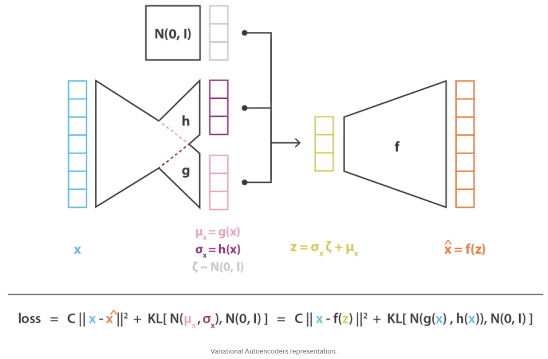 最后,以这种方式获得的变分自编码器结构的目标函数由上一节的最后一个方程给出,其中理论期望被一个或多或少精确的蒙特卡罗近似所取代,该近似在大多数情况下由单个绘制组成。因此,考虑到这个近似并表示C=1/(2c),我们恢复在上一节中直观导出的损失函数,由重建项、正则化项和定义这两个项的相对权重的常数组成。