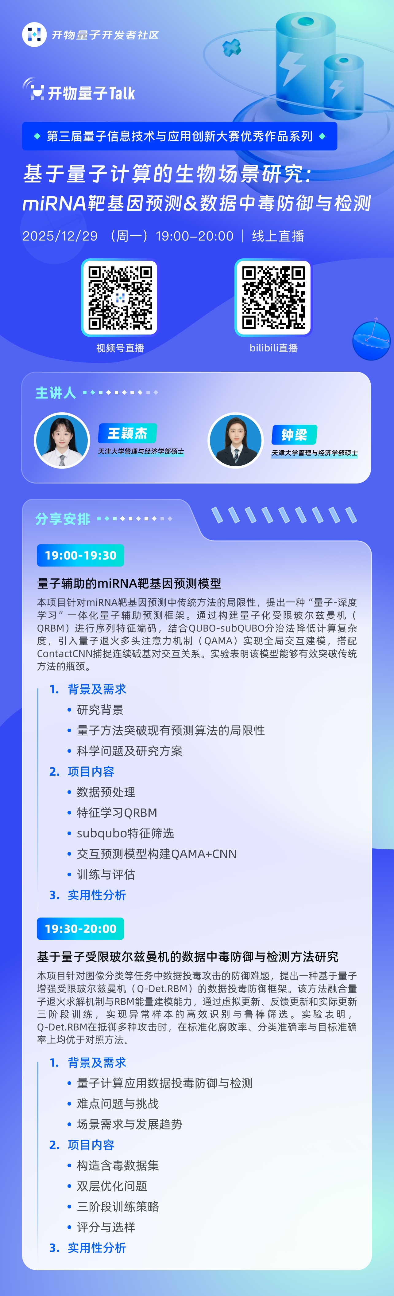 首期直播我们邀请到来自天津大学管理与经济学部的王颖杰和钟梁同学,她们将分享团队在量子计算和生物以及数据安全领域中的交叉研究成果,分别针对生物信息学中靶基因预测的精度瓶颈,以及人工智能领域数据投毒攻击的防御难题,系统展示“量子玻尔兹曼机”在解决高维、复杂生物数据问题上的潜力。