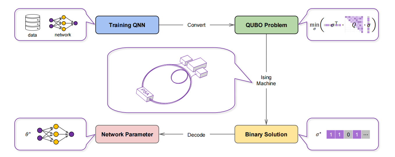 文章概要:本文提出了一种训练量化神经网络(QNN,Quantized Neural Network)的Ising算法,该算法结合拓扑网络的二值表示和损失函数的降阶方法,实现量化神经网络到二次约束二值优化问题(QCBO)再到二次无约束二值优化问题(QUBO)的转变,使其能够在量子计算机(如相干伊辛机CIM)进行求解。通过在用Fixstars Amplify AE进行三个实 ...