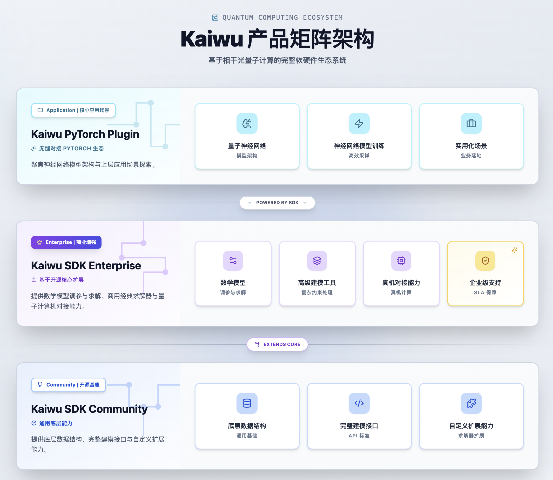通过依托自有三大产品技术基础——相干光量子计算机、Kaiwu SDK及量子玻尔兹曼机神经网络,玻色量子已形成清晰的Kaiwu产品矩阵,持续为开发者提供坚实的软硬件支撑,此次开源的Kaiwu SDK社区版(Kaiwu SDK Community)属于基础层: