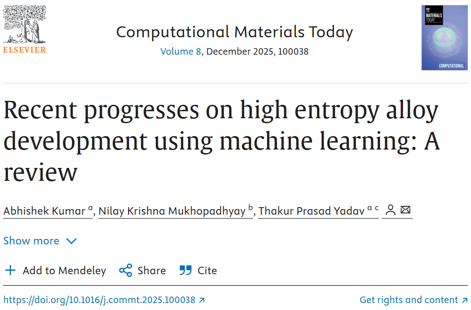 高熵合金(HEAs)作为多主元元素构成的新型材料,凭借高强度、耐腐、耐高温等优异性能,在航空航天、生物医疗等领域极具潜力。但传统研发依赖 “试错法”,面对海量成分组合与复杂性能调控规律,不仅周期长达数年,还需耗费巨额成本。国际团队在《Computational Materials Today》发表综述,系统梳理机器学习(ML)在高熵合金研发中的应用进展 —— 通过数据驱动建模,实现相结构、力学性能等关键指标的精准预测,将研发周期缩短至数周,彻底革新材料研发范式。