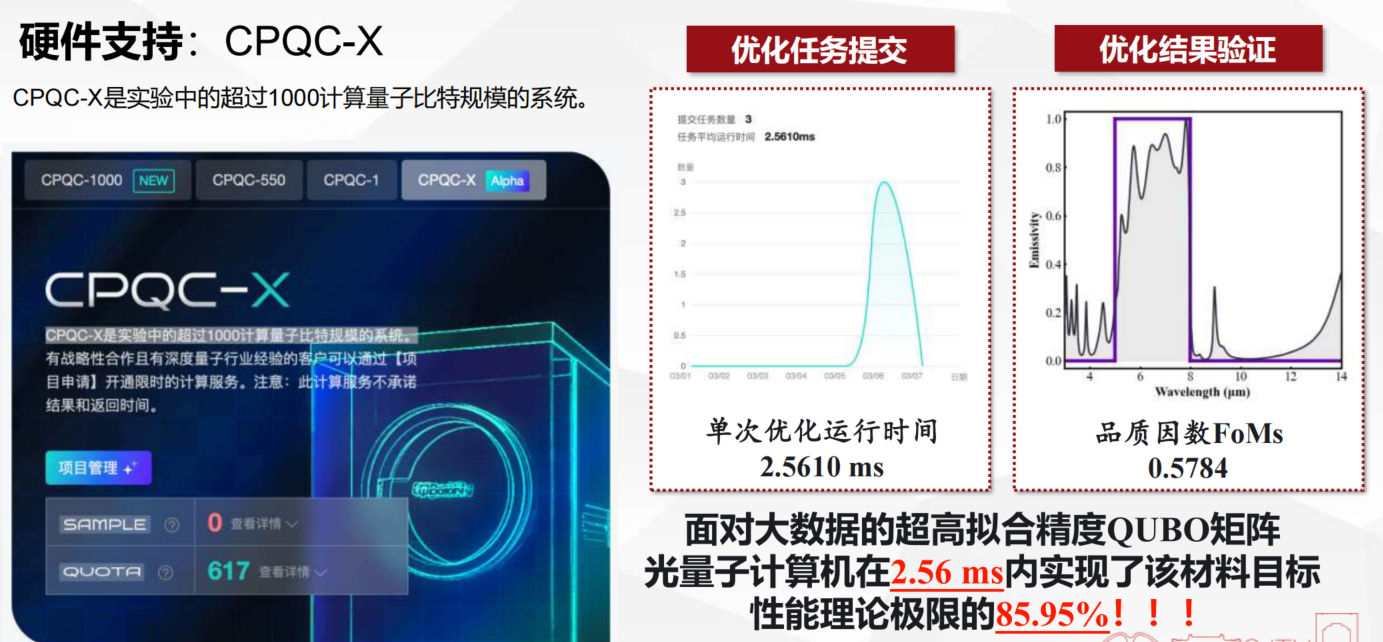 而在国产硬件的实测中,具备“全连接”优势的相干伊辛机(CIM),在面对 10.2 万规模的大数据样本优化时,国产相干光量子计算机(玻色量子提供)仅在 2.56 毫秒内便实现了目标性能理论极限的 85.95%,该结果比国际领先的 D-Wave 量子退火机单次优化的 85.82% 还略胜一筹。