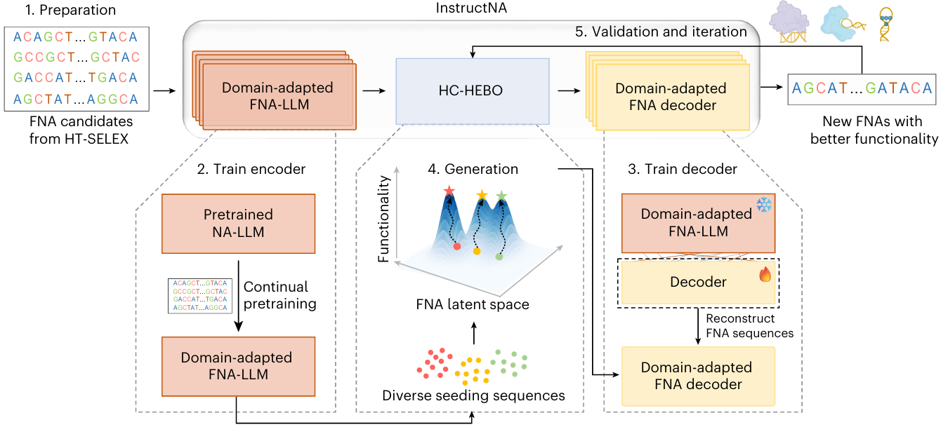 InstructNA 的核心思路,是把大语言模型高通量筛选数据结合,让 AI 先学会功能核酸的 “语法”,再按功能直接生成。