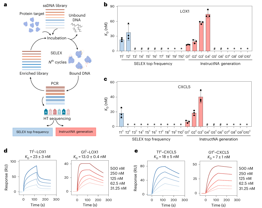 InstructNA 用大语言模型重新定义了功能核酸的研发方式。它不需要蛋白结构、不需要先验配体,只靠 HT-SELEX 数据,就能批量生成高活性、高多样性的适配体与功能 DNA。在 LOX1 与 CXCL5 上,它把强结合适配体产量提升数倍,亲和力达到纳摩尔级,序列相似度低至 38%,实验与计算完全互相验证。