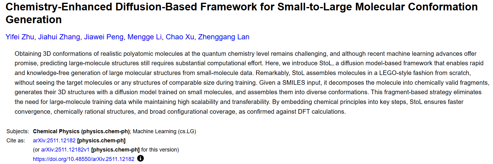 分子越大,构象越难算,这是计算化学持续多年的痛点。StoL 用 “拆解 — 生成 — 组装” 的 LEGO 式策略,配合化学增强扩散模型,给出了一套轻巧却强大的解决方案。它只学小分子,就能做大分子;只输 SMILES,就能出一整套合理 3D 构象;比传统工具覆盖更广,比纯数据 AI 更化学可信,还能稳定找到能量更低的优势构象。从药物筛选、分子模拟到催化设计,StoL 都能快速提供高质量初始构象,把过去要算几天的构象搜索,压缩到小时甚至分钟级。