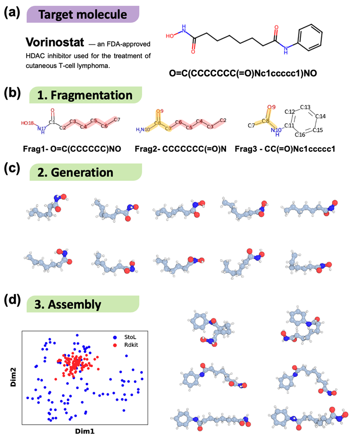 StoL 先把它切成三块,分别生成碎片构象,再组装成完整分子。结果显示,StoL 生成的构象在空间里分布更广、更均匀,而传统工具 RDKit 只集中在一小块区域。