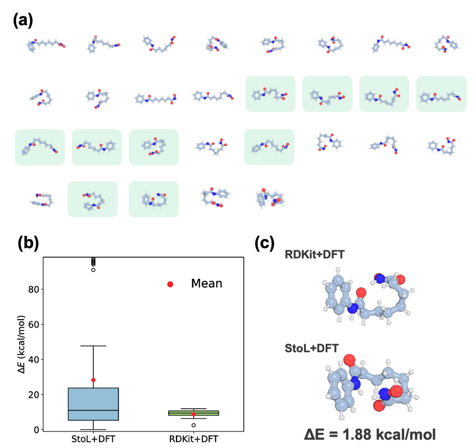 相比于传统方法,StoL 在构象覆盖度、结构合理性、低能构象搜索能力上全面占优,尤其适合柔性药物分子、环境污染物、有机催化中间体等缺乏高质量构象的体系。