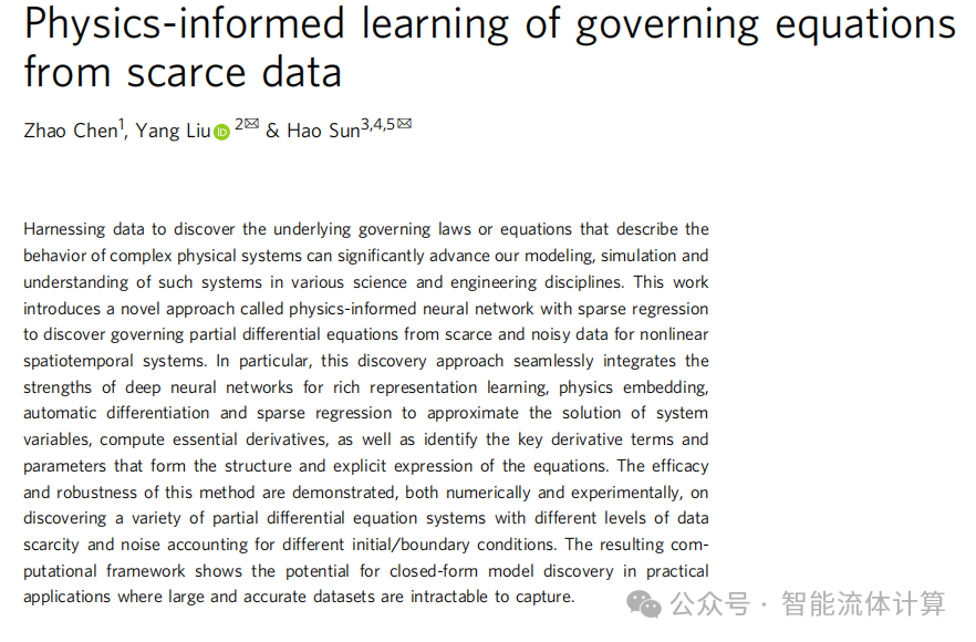 自动微分被证明是解决上述问题的有效工具,这在物理启发神经网络 (PINN) 中成功应用于非线性 PDE 的正向和反向分析。特别地,深度神经网络 (DNN) 用于逼近由 PDE 和少量可用数据约束的解。PINN 在解决各种科学问题 (如流体流动、涡旋诱导振动、心血管系统等) 时引起了越来越多的关注,特别是在 PDE 的显式形式已知的情况下。最近,Raissi 的一项重要工作介绍了一种深度隐藏物理模型,基于稀疏数据进行时空动态的数据驱动建模,其中未知的潜在物理通过可能的 PDE 项以弱约束的方式施加并由辅助神经网络隐式学习。然而,所得到的模型仍然是一个 “黑箱”, 缺乏足够的可解释性,因为无法揭示闭合形式的控制方程。最新研究显示,在预定义的 PDE 项库的约束搜索空间中,使用 DNN 和自动微分从嘈杂数据中获取闭合形式的 PDE 的潜力;然而,由于使用较不严格的稀疏回归和 DNN 训练而发生的假阳性识别也时有发生。事实上,同时优化 DNN 参数和稀疏 PDE 系数,同时准确地施加稀疏性,是一个复杂的任务,并且在闭合形式 PDE 的发现中仍然是一项重要挑战。