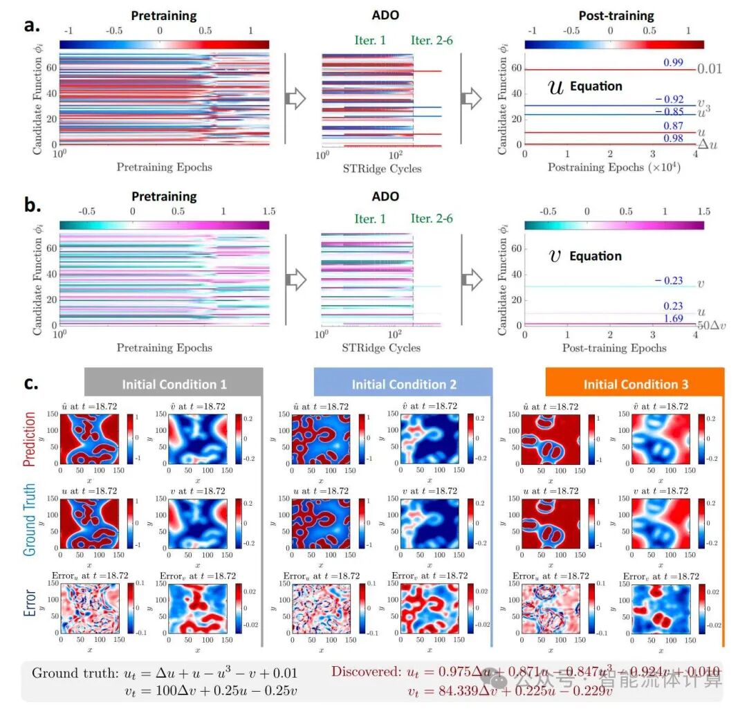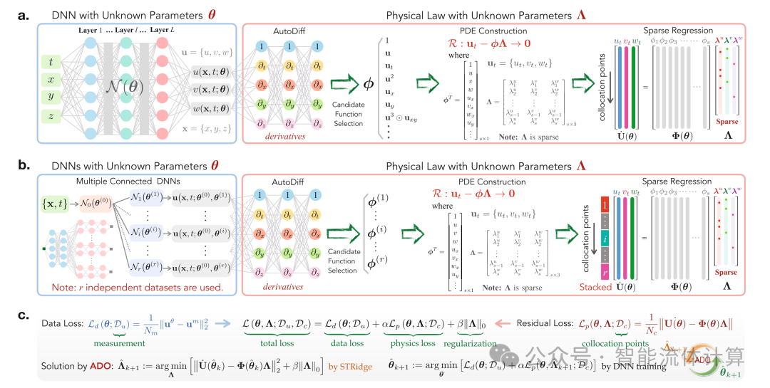 其中,α 是残差物理损失函数的相对权重;β 是正则化参数;表示 ℓ0 范数。优化总损失函数可以产生一个 DNN, 它不仅能够预测基于数据的全场系统响应,还能够揭示简约的闭合 PDE, 即 f θ˙∗,Λ∗:=argminθ,ΛL(θ,Λ,Du,Dc) , 其中 θ∗,Λ∗ 表示最优参数集合。值得注意的是,总损失函数具有隐式复杂形式,因此直接求解优化问题是高度不可行的,因为 ℓ0 正则化使这个问题变成 NP 难题。为了解决这个挑战,我们提出了一种交替方向优化 (ADO) 算法,将整体优化问题分解为一组可处理的子问题,以便在几次交替迭代中顺序优化可训练参数,如图 1c 所示。在运行 ADO 算法进行发现之前,PINN-SR 的预训练通过简单地用 ∥Λ∥1 替换 Eq. (3) 中的 ∥Λ∥0 来进行,其中对 θ 和 的强制梯度优化变得适用。ℓ1 正则化的预训练可以通过提供一个可接受的 “初始猜测” 来加速 ADO 的收敛。更详细的公式和算法描述见方法部分和补充说明 1。