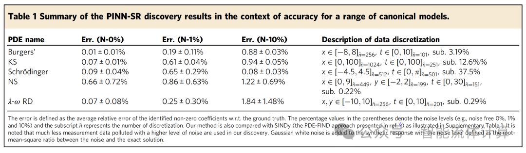 表 1: PINN-SR 发现结果的总结,包括多种基准模型的准确性。