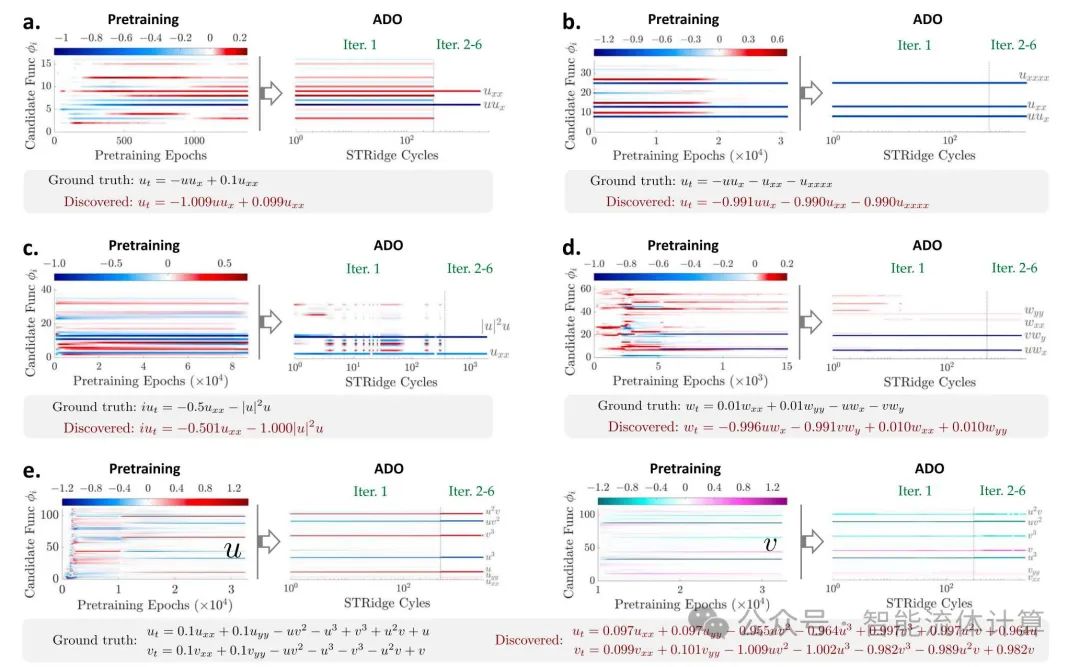 图. 2: 针对稀疏采样测量数据 (10% 噪声) 发现的选定基准 PDE。a. 发现的 Burgers’ 方程:用于构建 PDE 的 16 个候选函数 ϕ∈R16 的稀疏系数 Λ 的演变,其中颜色代表系数值。b. 发现的 KS 方程:36 个候选函数 ϕ∈R36 的稀疏系数 Λ 的演变。c. 发现的非线性薛定谔方程:候选函数 ϕ∈R40 的稀疏系数 Λ 的演变。d. 发现的 NS 方程:60 个候选函数 ϕ∈R60 的稀疏系数 Λ 的演变。e. 发现的 RD 方程:用于重建 u 方程和 v 方程的 110 个候选函数 ϕ∈R110 的稀疏系数 λu∈R110 和 λv∈R110 的演变。