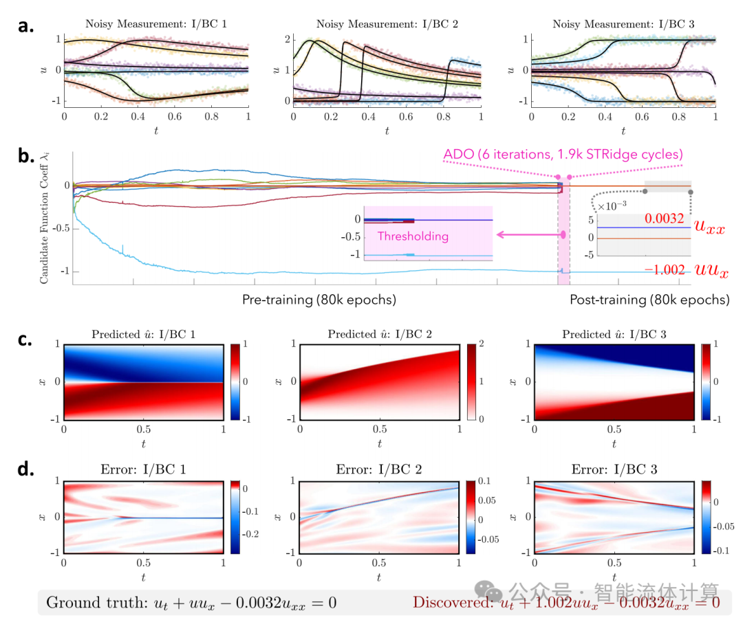 图. 3: 基于在 10% 噪声下采样的三个 I/BC 数据集发现的 Burgers’ 方程 (小粘度)。a. 三个数据集的嘈杂测量可视化。注意,虽然有 30 个传感器,但仅在此图中显示了一部分。b. 用于构建 PDE 的 16 个候选函数 ϕ∈R16 的稀疏系数 Λ∈R16 的演变,其中颜色表示系数值。正确的项 (uux 和 uxx) 及其系数成功识别,而其他冗余项通过 ADO 被消除。c, d. 三个 I/BC 情况下的预测响应和误差。由于可视化几乎与预测无法区分,因此未列出真实值 (见补充图 7)。堆叠预测的全场 ℓ2 相对误差为 0.65%。