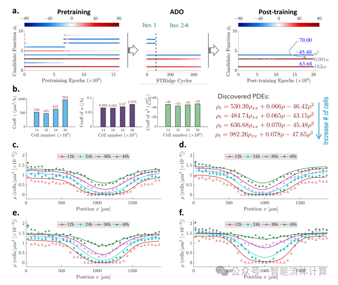 最后一个示例展示了提出的方法用于发现描述细胞迁移和增殖的控制 PDE, 基于从体外细胞迁移 (划痕) 实验中收集的稀疏和嘈杂的实验数据。不同时间点 (0 小时、12 小时、24 小时、36 小时、48 小时) 的 1D 细胞密度分布通过高分辨率成像提取,采用图像分割和细胞计数的方法进行处理。根据不同的初始细胞密度 (例如,总细胞数从 10,000 到 20,000) 进行了多次实验,按照在补充图 10 中显示的测试孔的指定初始分布进行设置。实验设置和数据集的更详细描述见参考文献 46。我们在这里的目标是揭示用于建模细胞密度动态的简约 PDE。这里我们考虑了细胞初始数量范围从 14,000、16,000、18,000 到 20,000 的四种场景。我们从三次相同准备的实验重复中取平均值,以训练我们在图 1a 中展示的模型用于 PDE 发现。鉴于我们先前知道细胞动态可以通过扩散 (迁移) 和反应 (增殖) 过程来描述,我们假设 PDE 具有以下形式: