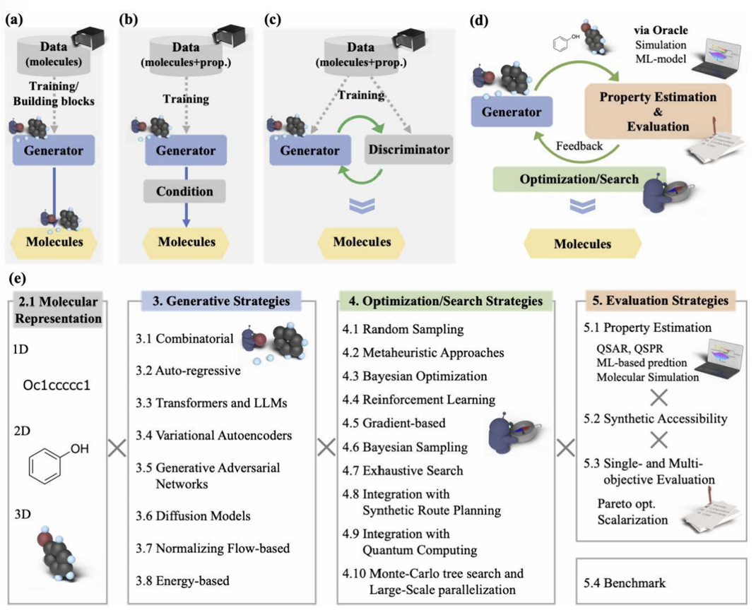 现代分子生成 AI 不是单一模型,而是一套完整体系,由四个核心模块组成:
