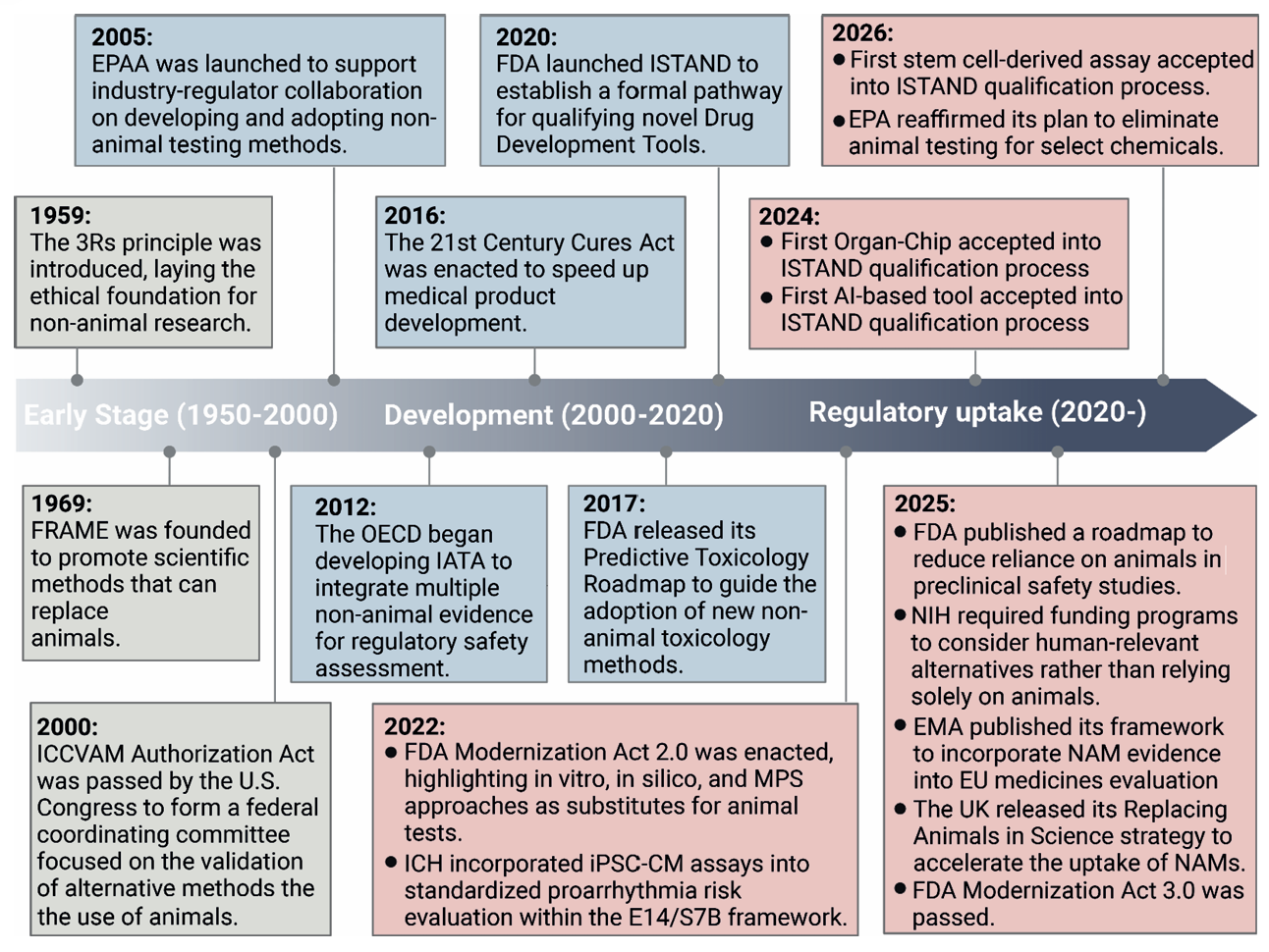 以人为中心的药物研发范式能够快速推进,离不开全球监管体系的同步革新。美国、欧盟、英国、日本等主要医药监管机构相继发布政策,明确支持 NAMs 替代动物实验,并建立标准化验证与认可通道。FDA 推出 ISTAND 计划,专门对器官芯片、AI 模型等新型技术进行资格认定;OECD 发布体外方法良好实践规范,推动全球技术标准统一;多国法规明确允许在新药申报中使用体外数据与计算模型替代动物实验数据。