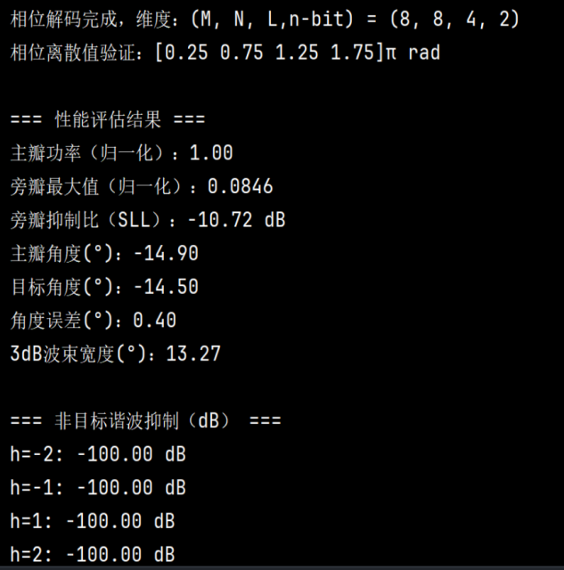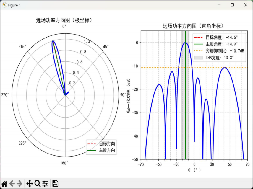 极坐标图:直观呈现主瓣指向(−14.9∘)与旁瓣分布,主瓣功率归一化为 1.0,旁瓣最大值为 0.0846:直角坐标图:标注目标角度(−14.5∘)、主瓣角度(−14.9 ∘)、3dB 波束宽度(13.27∘)及旁瓣抑制比(−10.72 dB),量化性能指标。