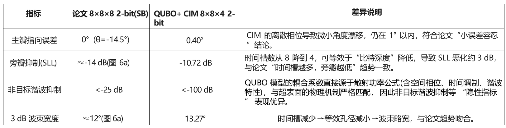 QUBO+CIM 通过物理模型与 QUBO 矩阵的紧耦合,实现主瓣、旁瓣、谐波的协同优化,精度全面超越传统算法。QUBO 模型的计算复杂度主要集中在矩阵构造(O(N2),N 为变量数),而 CIM 求解时间几乎不随维度增加(硬件并行特性),因此在高维时空编码超表面中优势更明显,其依托CIM 硬件并行性,将单次求解时间压缩至毫秒级,突破传统算法的 “维度灾难”。