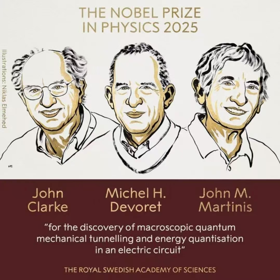 2025年10月7日,2025年诺贝尔物理学奖的揭晓为量子计算写下历史性注脚:约翰·克拉克(John Clarke)、米歇尔·H·德沃雷特(Michel H. Devoret)与约翰·M·马蒂尼斯(John M. Martinis)因“发现宏观量子力学隧穿效应以及电路中的能量量子化现象”(for the discovery of macroscopic quantum mechanical tunnelling and energy quantisation in an electric circuit)摘得桂冠。